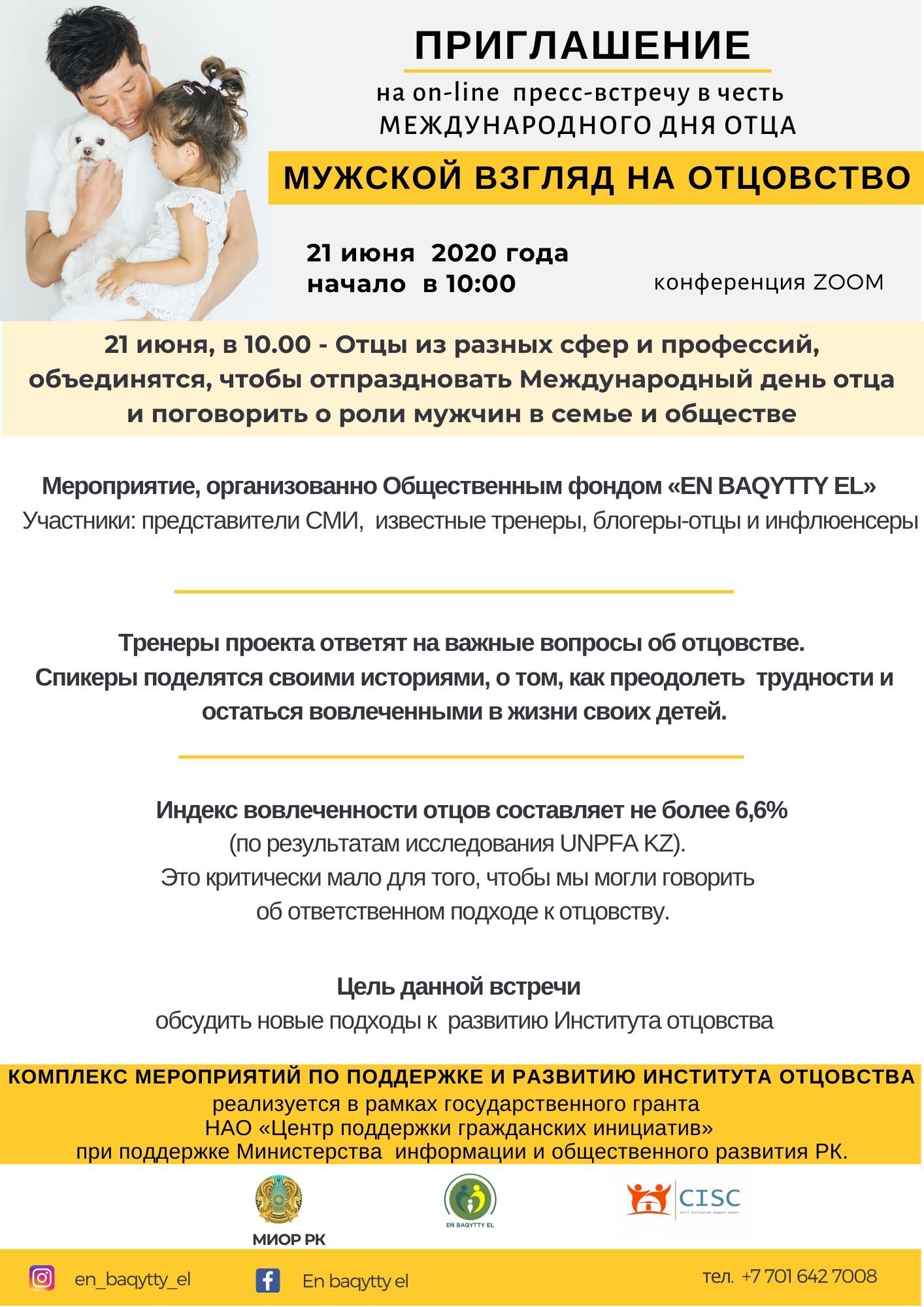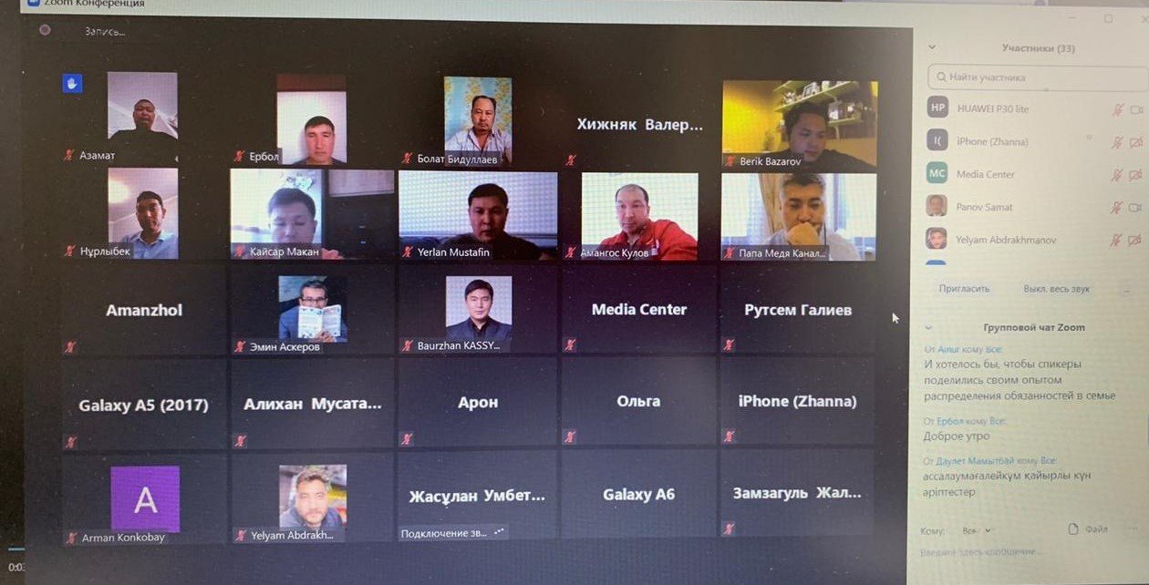 ZOOM. Ее организаторами стал Общественный фонд «EN BAQYTTY EL», который при поддержке Министерства информации и общественного развития Республики Казахстан в рамках государственного гранта НАО «Центр поддержки гражданских инициатив» в Казахстане реализует «Комплекс мероприятий по поддержке и развитию института отцовства».